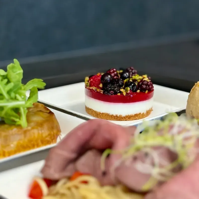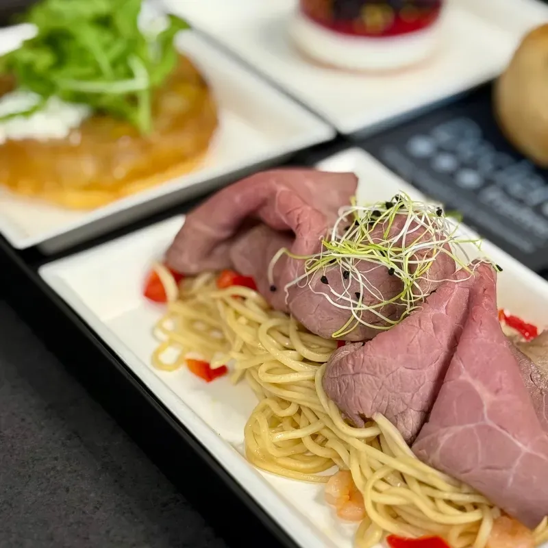 • Plat : Rôti de bœuf aux saveurs asiatiques, salade de nouilles, légumes croquants et crevettes