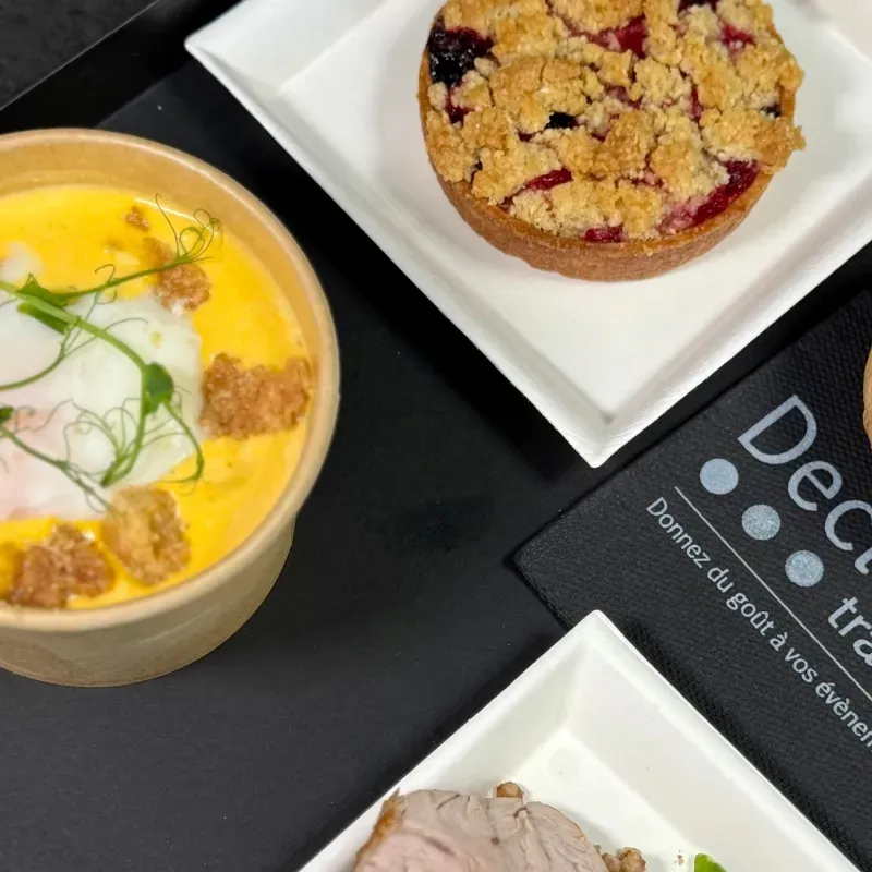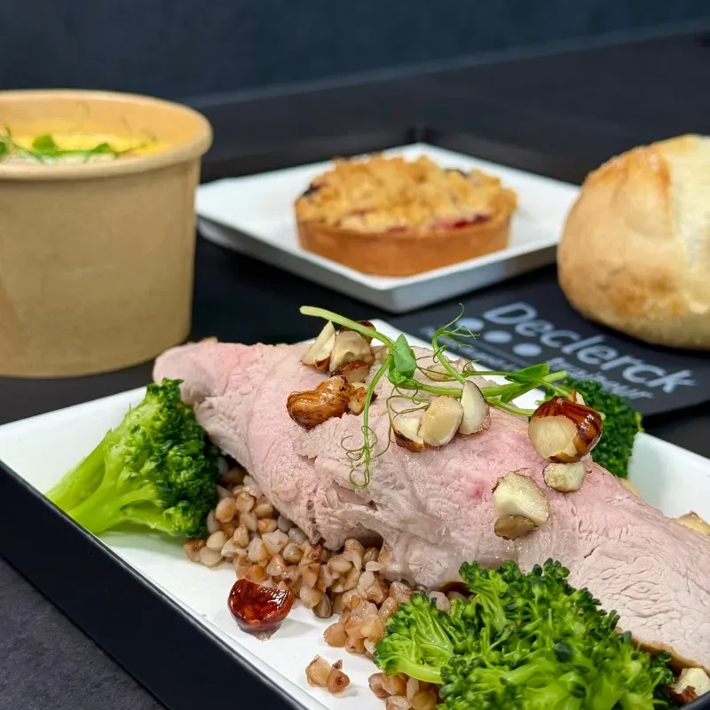• Plat : Émincé de veau basse température, salade de sarrasin, fleurettes de brocoli, huile de noisette torréfiée