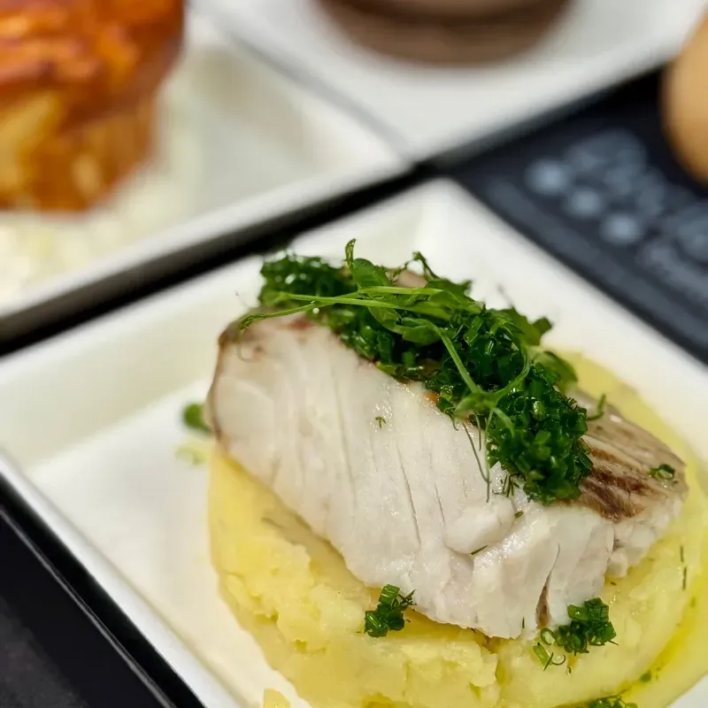 • Plat : Dos de lieu noir confit, écrasé de pommes de terre à l'huile d'olive et citron confit, huile de combawa