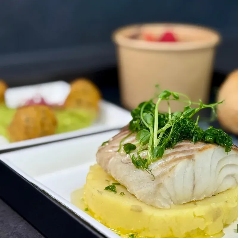 • Plat : Dos de lieu noir confit, écrasé de pomme de terre à l'huile d'olive et citron confit, huile de combawa