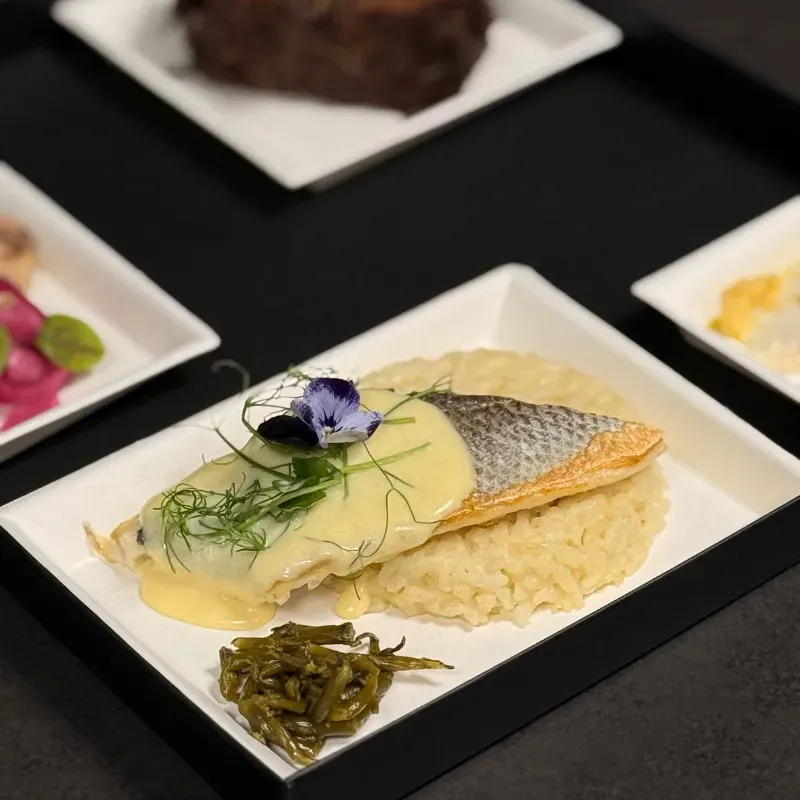 • Plat : Filet de bar rôti, risotto citronné embeurré de salicorne et beurre blanc