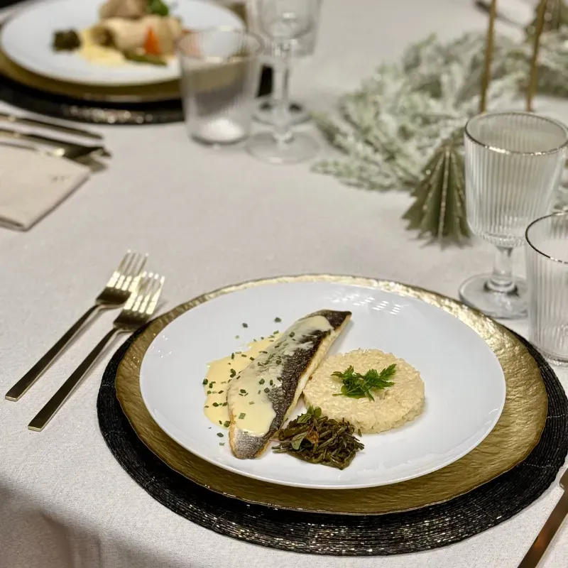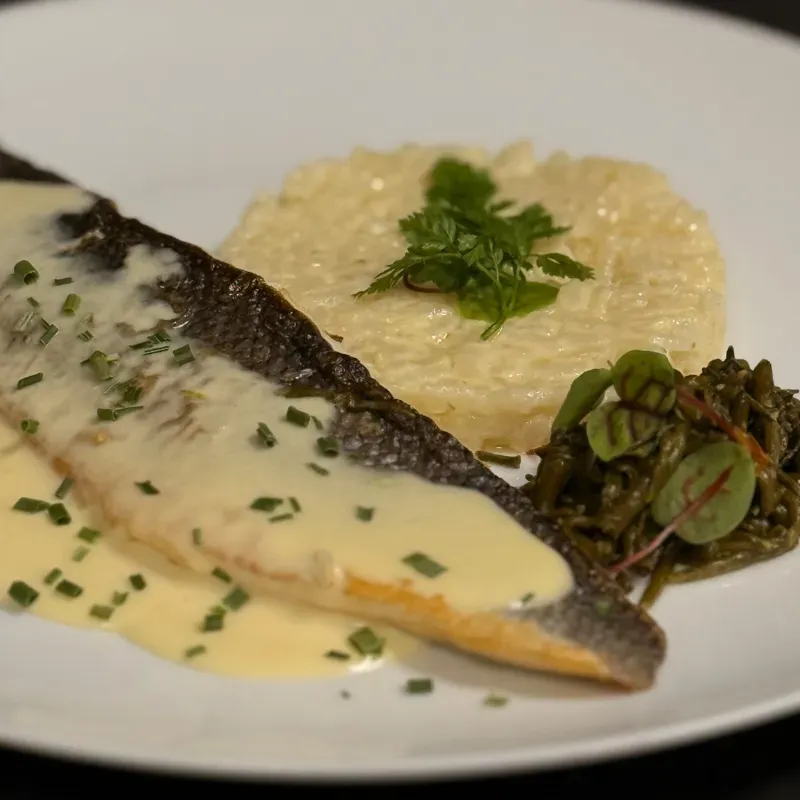 Filet de bar rôti, risotto citronné embeurrée de salicornes et beurre blanc